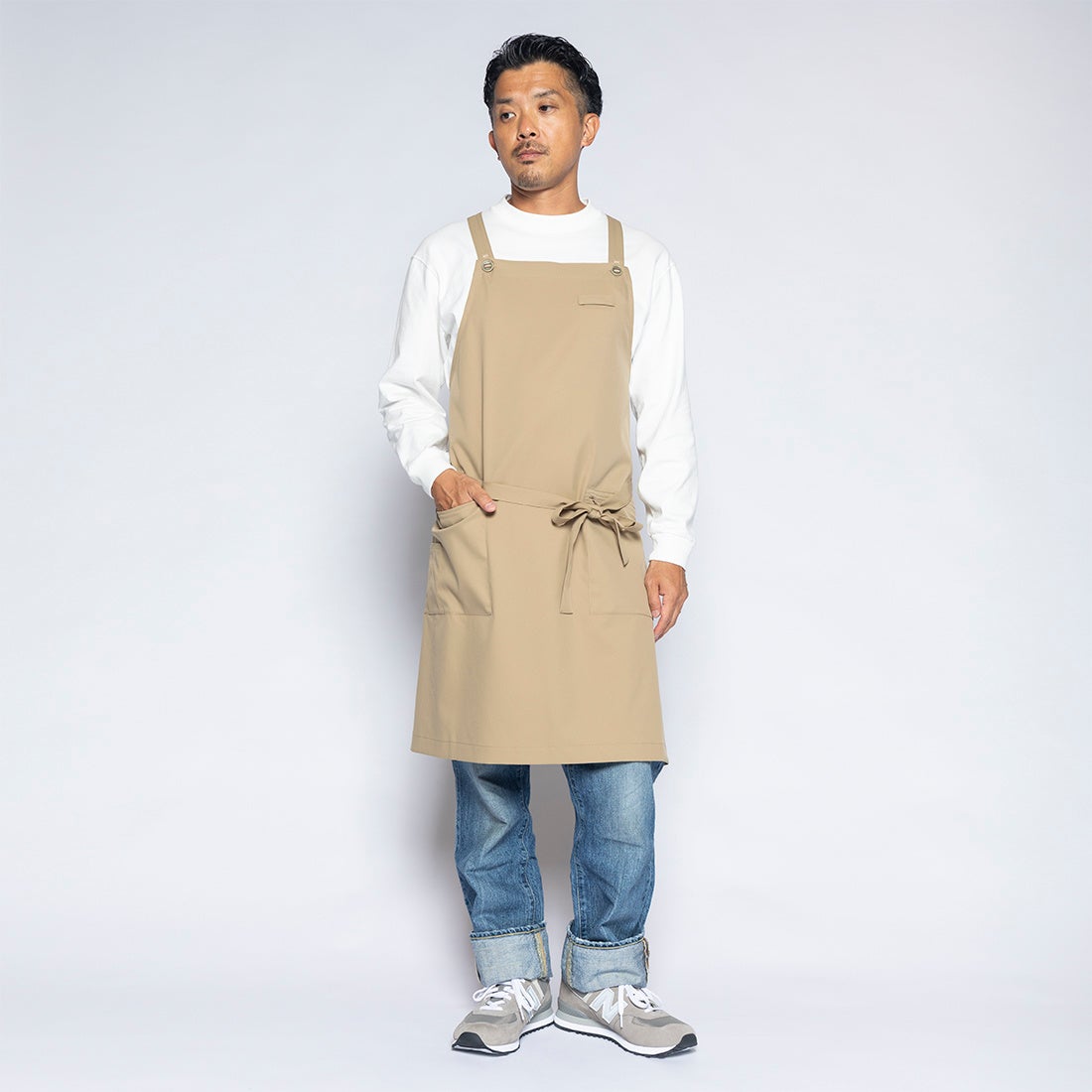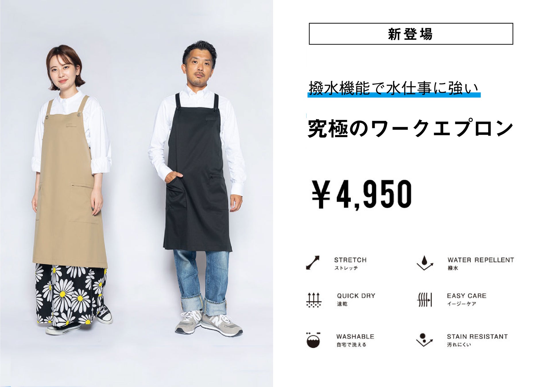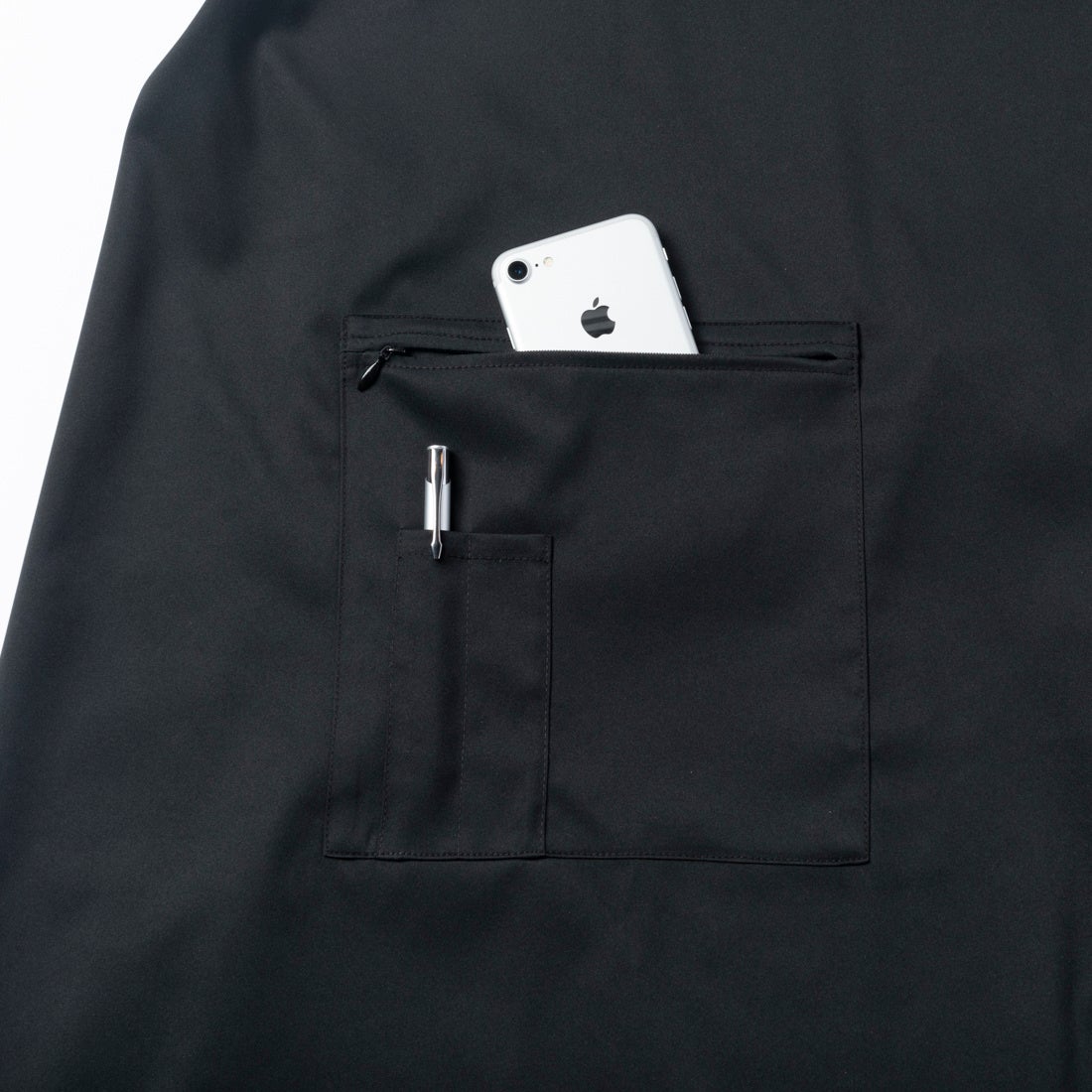 簡単に洗えて撥水性がある自社商品をエプロン代わりとして使用している導入企業が複数社いたことに着眼し、開発に至りました。生地には自社オリジナル素材「ultimex」を使用し、ストレッチ性、速乾、撥水、水洗い可、イージーケアの機能性を実現。ユニセックスで着用できるよう、身長・体形に合わせて