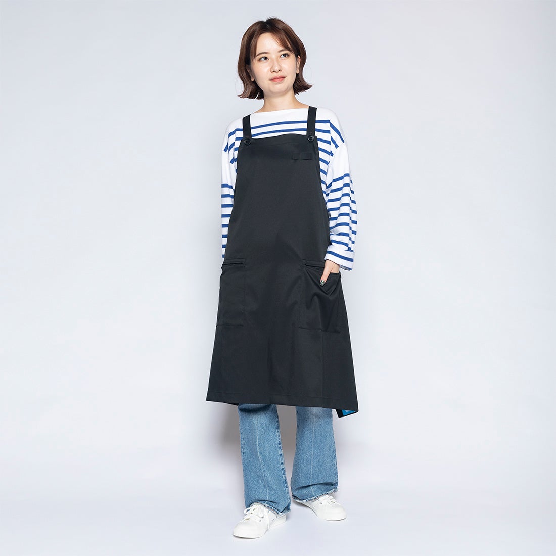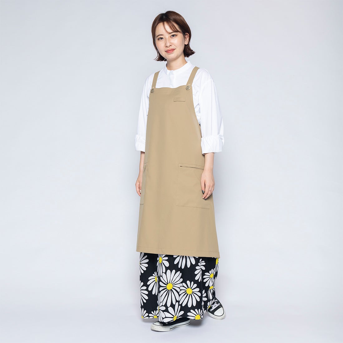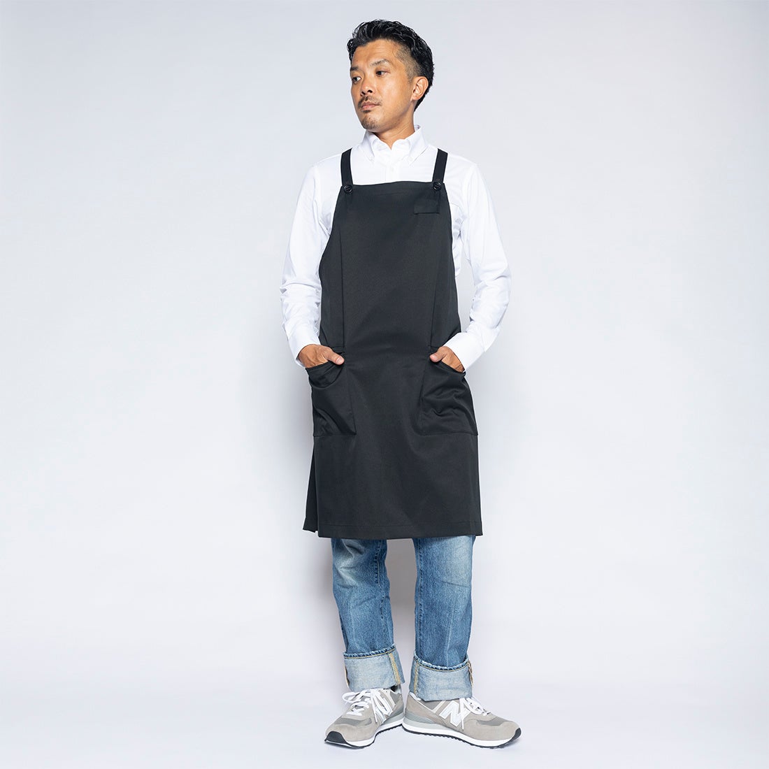 簡単に洗えて撥水性がある自社商品をエプロン代わりとして使用している導入企業が複数社いたことに着眼し、開発に至りました。生地には自社オリジナル素材「ultimex」を使用し、ストレッチ性、速乾、撥水、水洗い可、イージーケアの機能性を実現。ユニセックスで着用できるよう、身長・体形に合わせて